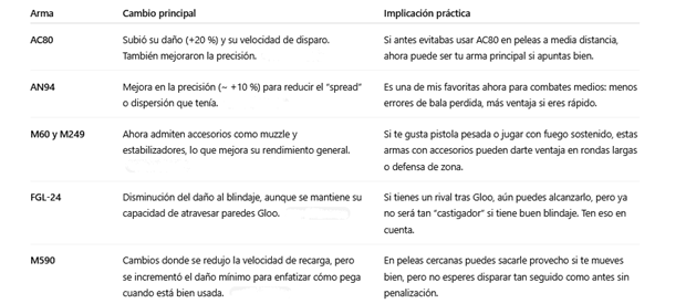 Al inicio de cada sesión, prefiero hacer unas partidas solo con las armas que cambiaron (como AC80 o AN94) para acostumbrarme al cambio de precisión o disparo. Eso ayuda mucho para que en modo competitivo ya sepas cómo se comportan.